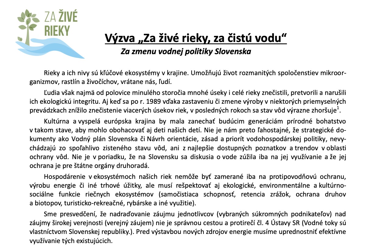 Výzva „Za živé rieky a čistú vodu – Za zmenu vodnej politiky Slovenska“